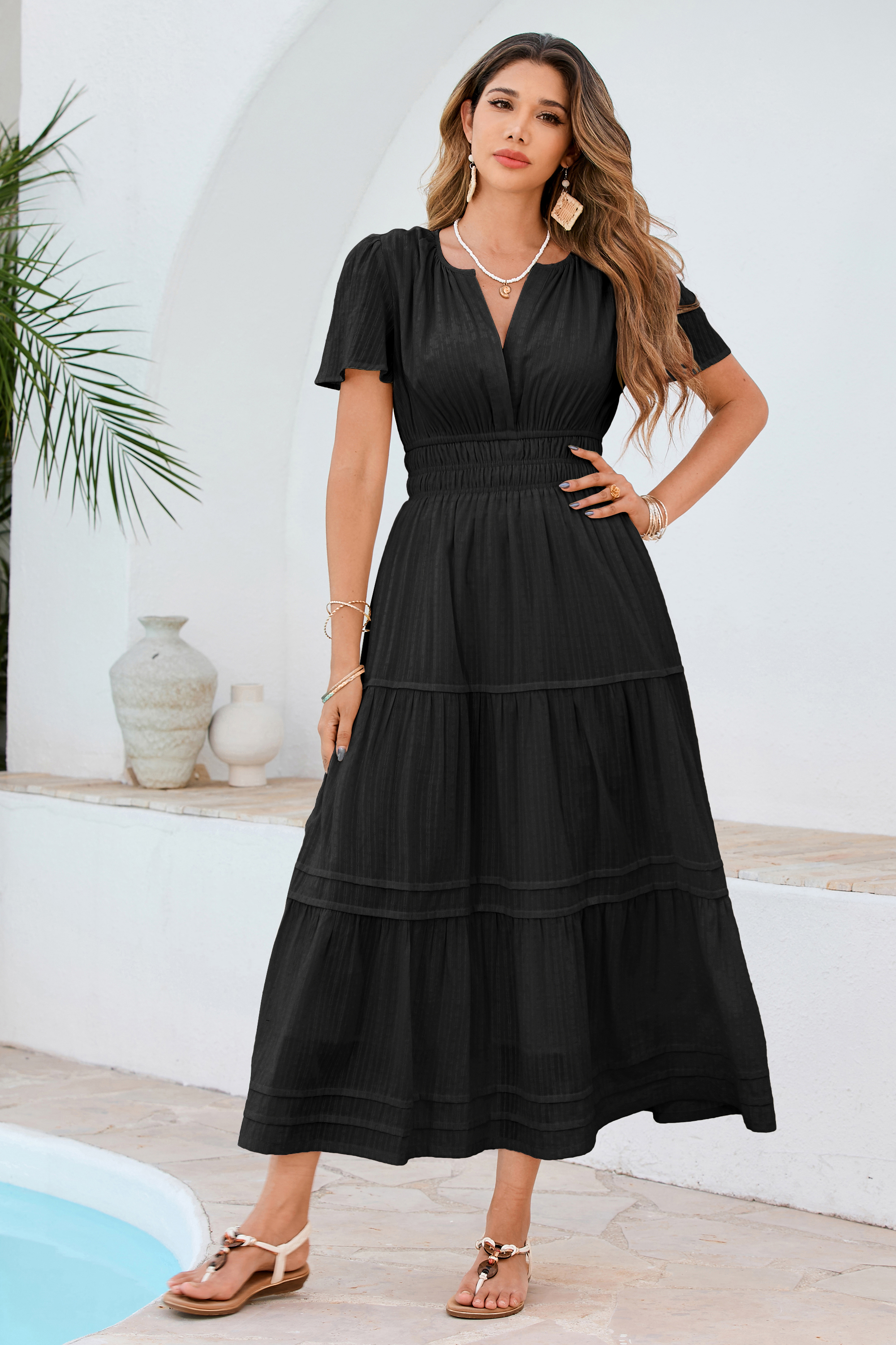 R.Vivimos Womens Summer Cotton Midi Dress 2025 Short Sleeve V Neck Elastic Waist Embroidered Tiered A-Line Long Dresses 3