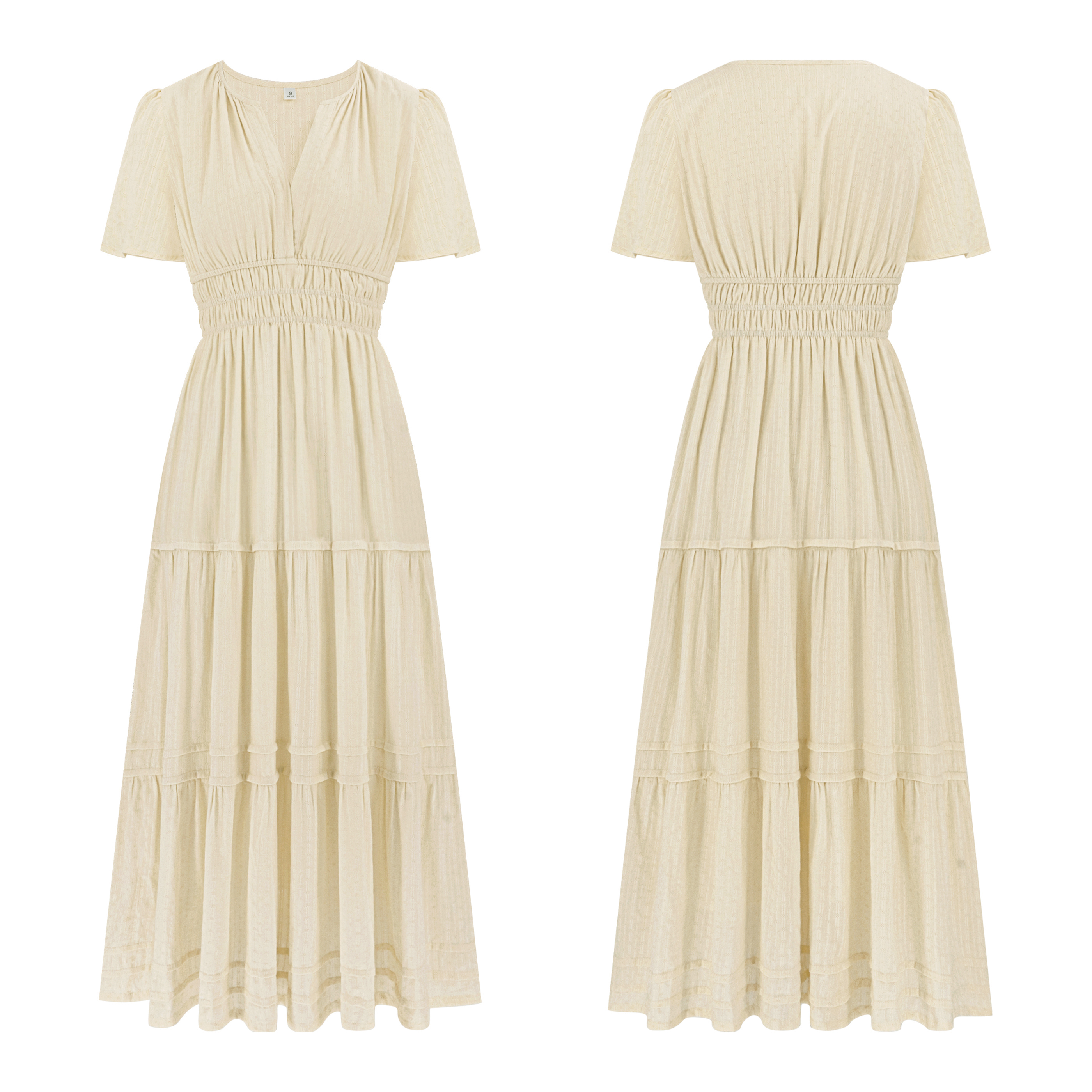 R.Vivimos Womens Summer Cotton Midi Dress 2025 Short Sleeve V Neck Elastic Waist Embroidered Tiered A-Line Long Dresses 9