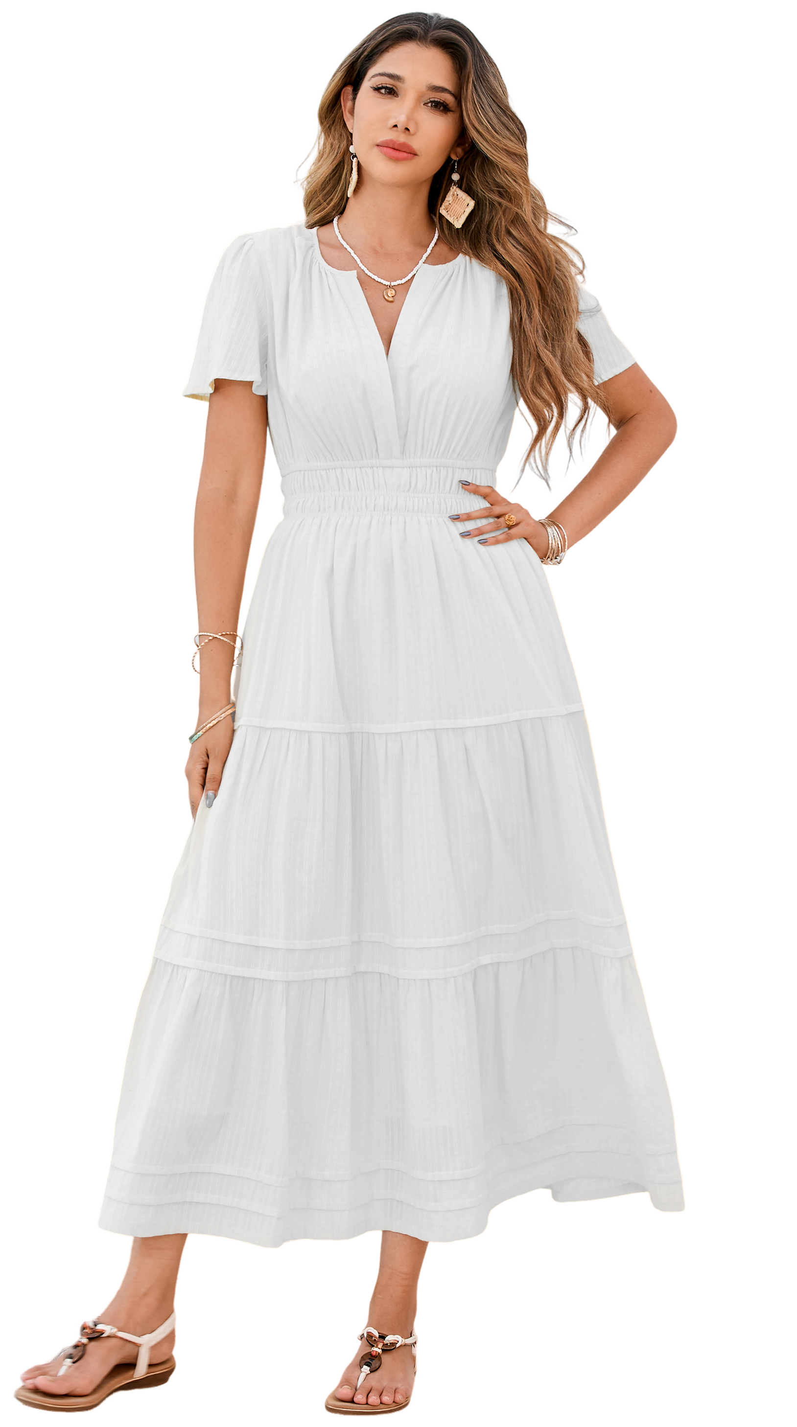 More information about R.Vivimos Womens Summer Cotton Midi Dress 2025 Short Sleeve V Neck Elastic Waist Embroidered Tiered A-Line Long Dresses