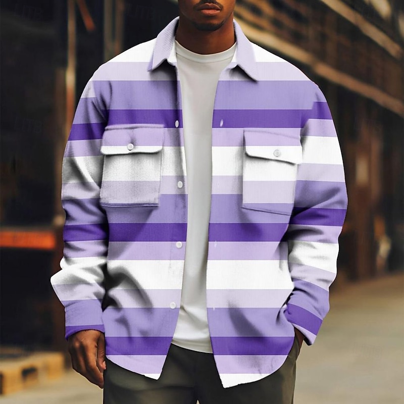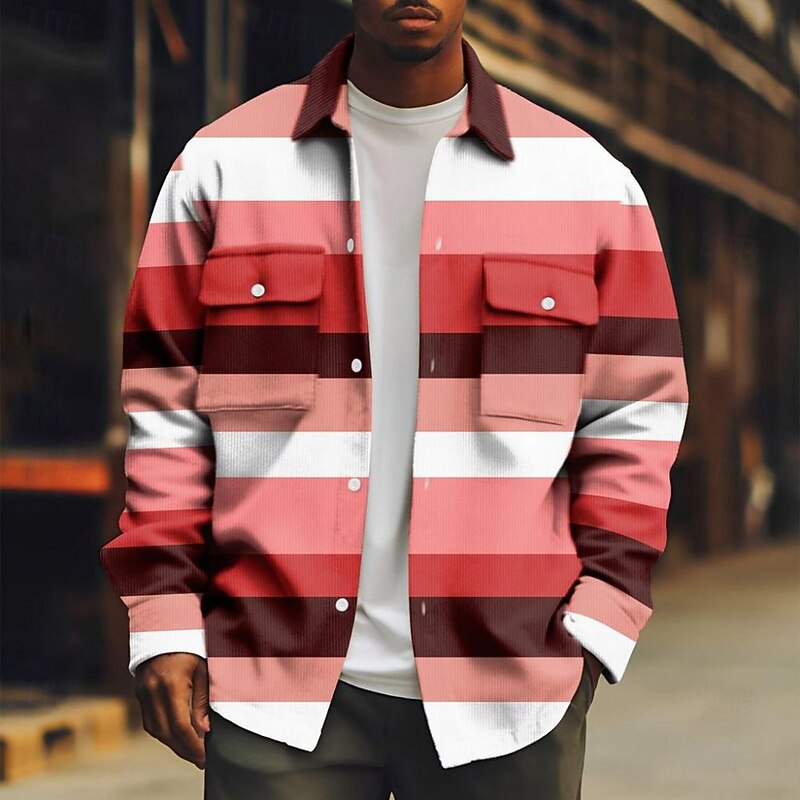 HOT ! Men's Horizontal Stripes Corduroy Shirt Shacket Shirt Jacket Long Sleeve Casual Outdoor Dailywear Fall Winter Turndown Button-Down Warm Jacket with Flap Pockets Light Green Pink Blue Sky Blue Purple