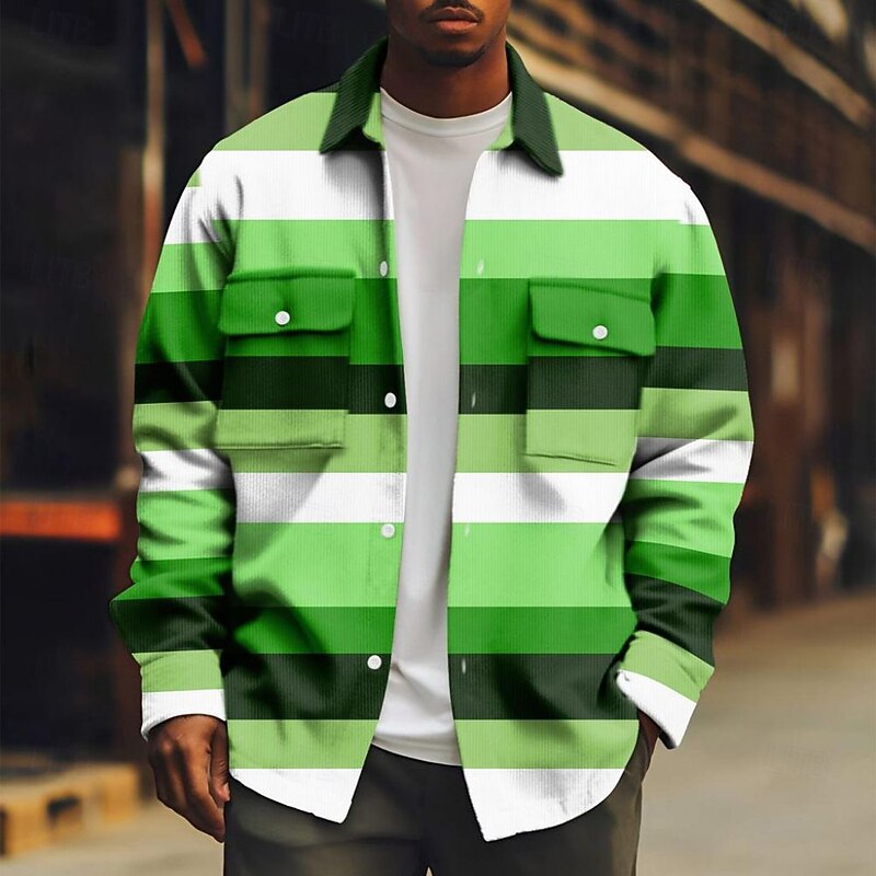 Men's Horizontal Stripes Corduroy Shirt Shacket Shirt Jacket Long Sleeve Casual Outdoor Dailywear Fall Winter Turndown Button-Down Warm Jacket with Flap Pockets Light Green Pink Blue Sky Blue Purple 1