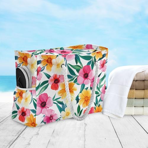 HOT ! Watercolor Flowers Colorful Beach Tote Bag for Women Beach Bags Waterproof Swim Pool Bag Extra Large Travel Tote Bags with Zipper for Grocery Vacation Essentials Yoga Nurse Gym