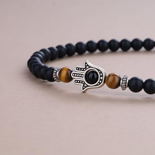 • Material: Matte Onyx (108 beads); Spacer beads: Tiger Eye, Vintage Alloy Hamsa Hand charm; Elastic nylon string