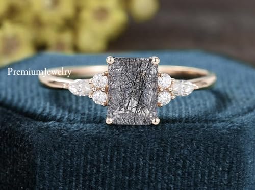 More information about Emerald Cut Black Rutilated Quartz Ring, Delicate Cz Engagement Ring, Wedding Ring Set for Women, Christmas Gift, Bridal Ring, 925 Sterling Silver Ring