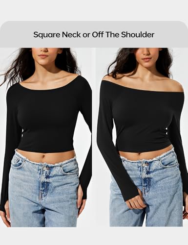 ZeroBound Built in Shelf Bra Off Shoulder Tops - Long Sleeve Off Shoulder Crop Shirts for Women, Basic Going Out Tops 1