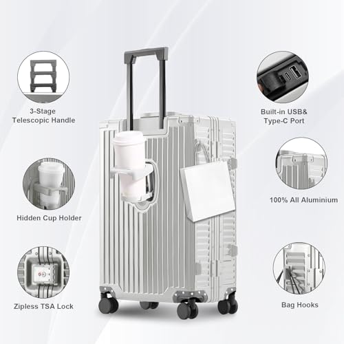 HOT ! Gets All Aluminum Carry on Luggage Airline Approved,20 Inch Hardshell Spinner Luggage With Cup Holder and USB Charger,TSA Lock,Front Pocket Durable Suitcase for Women Men-Silver,22x14x9