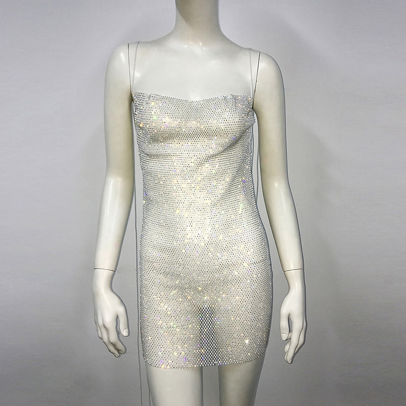 HOT ! Metallic Backless Sparkle Mini Dress Sheer Mesh Rhinestone Cover Up Disco Solid Color Fancy Dress Women's Party Club Adults' Dress Summer