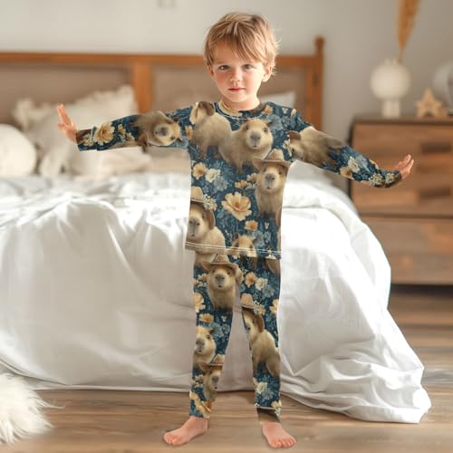 HOT ! Pajama Sets Long Sleeve Cute Capybara Floral Background Soft Comfy Sleepwear 2 Piece PJS 3-8T