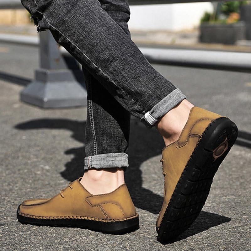 Men’s Hand Stitching Lace-up Flats Loafers Leather Casual Slip-Ons Outdoor Lightweight Vintage Non Slip Work Dress Driving Walking Shoes 6