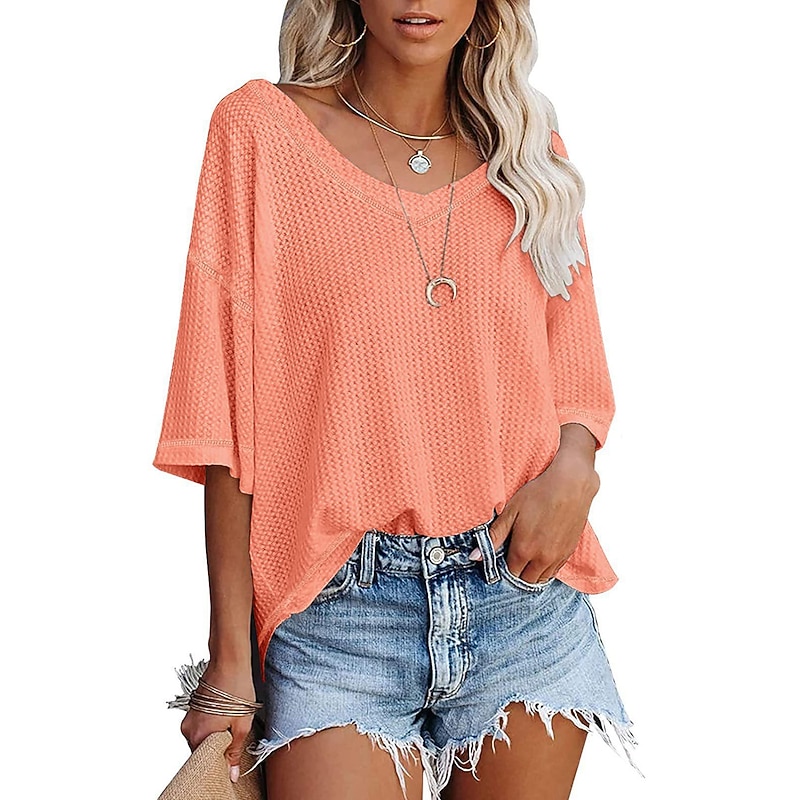 Highlights [Fabric] : Crafted from a blend of cotton and polyester, this summer top offers a soft and breathable feel, perfect for staying cool and comfortable during warm weather. [Fit] : The design features a relaxed, loose fit with short doll sleeves, providing effortless style and comfort for everyday wear. [Design Highlights] : This waffle knit t-shirt boasts a classic V-neck and solid color design, while the delicate texture adds an element of sophistication to the otherwise simple look. [Occasions] : Ideal for casual summer outings, this top pairs perfectly with denim shorts or your favorite jeans, providing a chic yet laid-back look suitable for beach trips, weekend gatherings, or leisurely strolls around the town. [Size Range] : Available in sizes S, M, L, XL, and 2XL, catering to a range of body types for the best fit. Available colors include Blue, Black, Light Grey, and Light Orange.