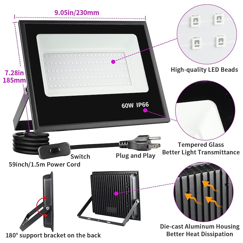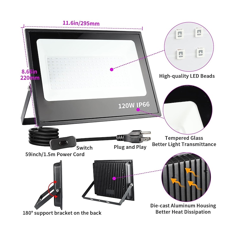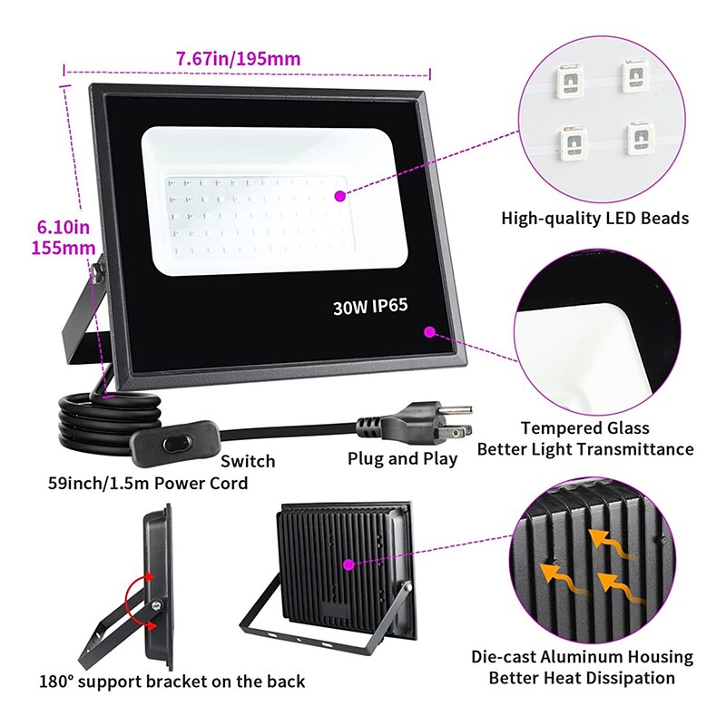 $65.99 - LED Black Lights 1-2 Pack of 30W 60W 120W UV Floodlight 395nm-405nm IP66 Waterproof High-power Black Light Plug with Switch (59in) for Parties Stages UV Resin Curing Paint for Halloween 2025. Shop for cheap Street Lights online? Buy at lightinthebox.com on sale today!