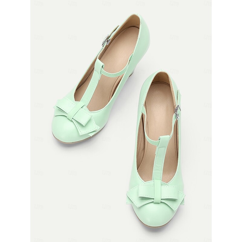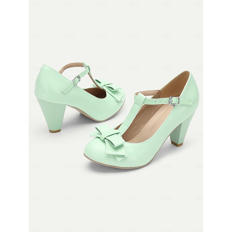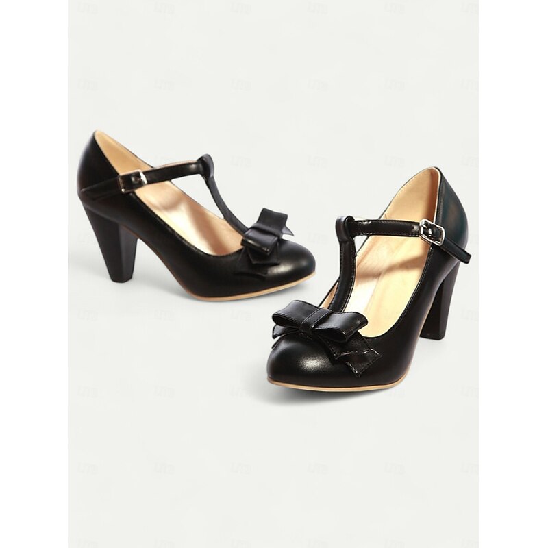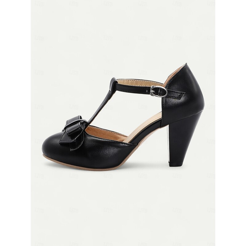 Highlights [Fabric] : Made from high-quality PU for the upper material and synthetic leather for the lining, these shoes promise durability and a sleek, polished appearance. The rubber outsole ensures a comfortable grip, making these heels perfect for all-day wear. [Silhouette] : These vintage-style pumps feature a classic T-strap design with a round toe and a sturdy cone heel for added stability. The structure provides a timeless silhouette that complements a variety of outfits. [Design Highlights] : Adorned with a chic bow detail at the toe and a secure buckle closure, these heels blend feminine elegance with vintage charm. The T-strap not only offers a secure fit but also enhances the shoe's stylish appeal. [Occasions] : Ideal for parties, formal events, and daily or work wear, these versatile heels are suitable for a range of settings, from elegant gatherings to casual outings, adding a touch of retro sophistication to any look. [Size Notice] : Available in a range of sizes from US5.5 to US10.5, these shoes are designed as standard size. It is recommended to select your usual size for the best fit.