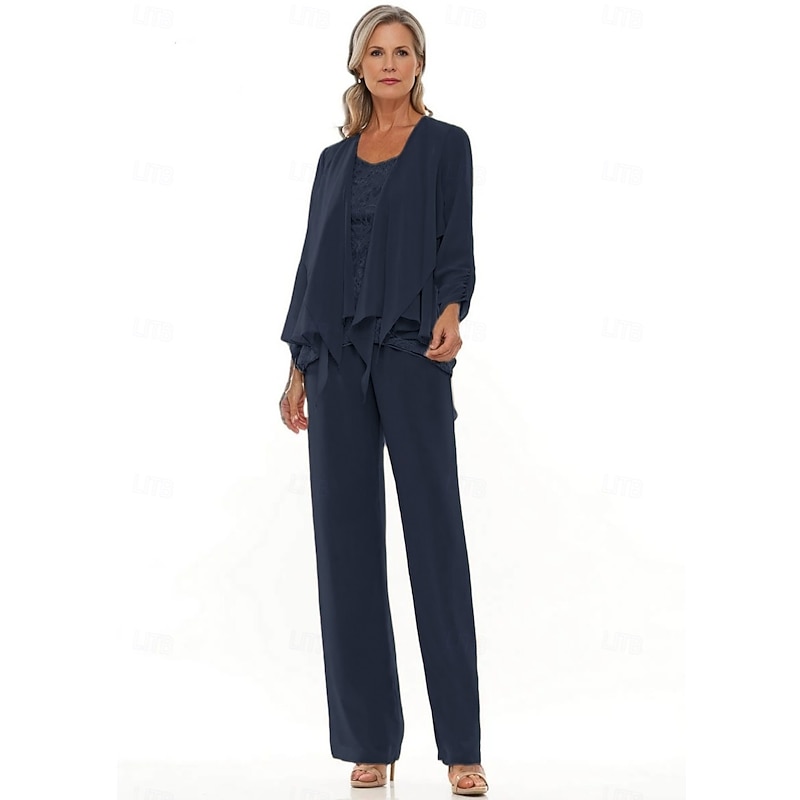 Pantsuit 3 Piece Mother of the Bride Wedding Elegant Crew Neck Floor Length Chiffon Long Sleeve with Lace Ruffles 9