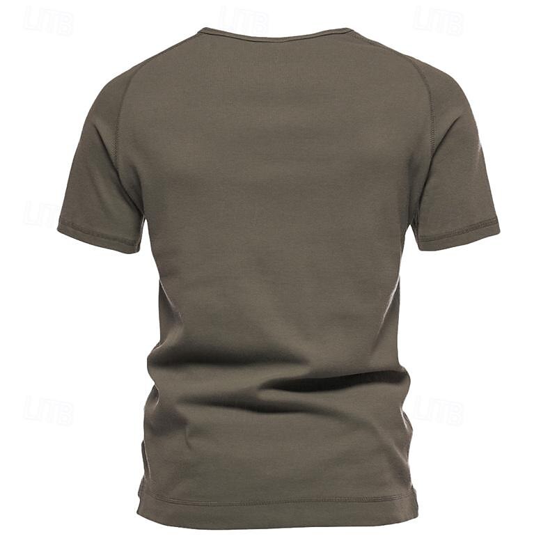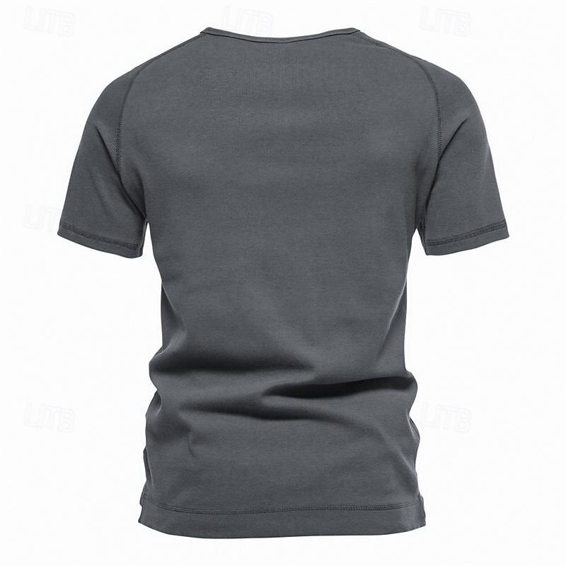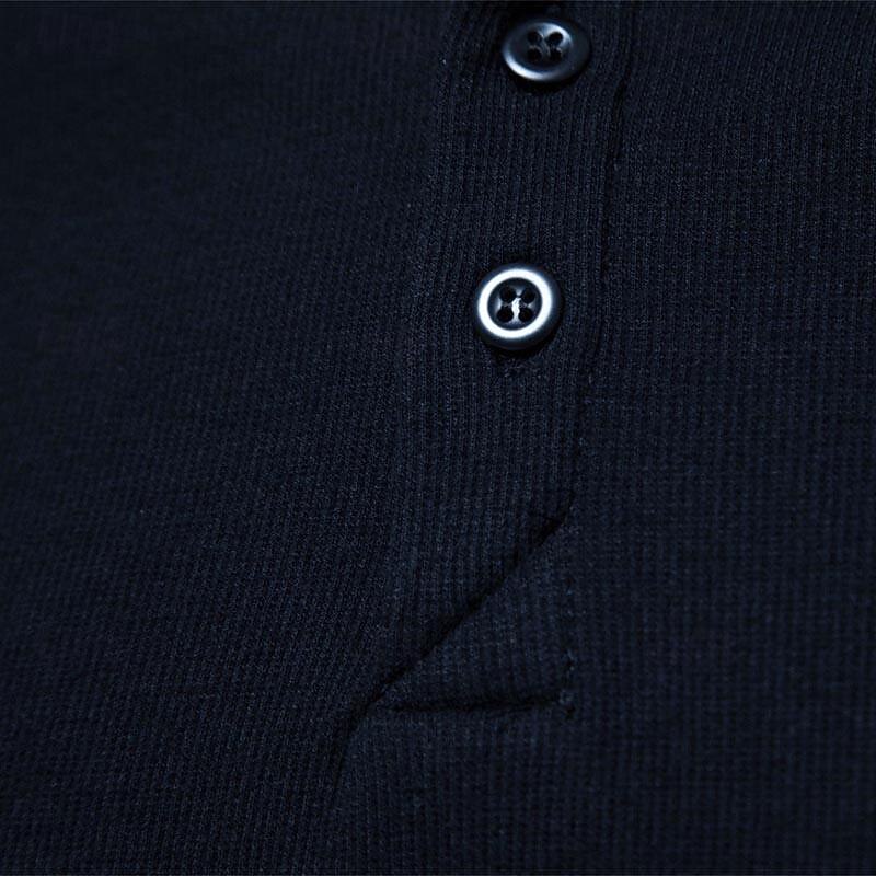 : The shirt features a classic Henley neckline with a three-button placket, adding an element of style and versatility to the design. Its plain pit strip pattern adds subtle texture, enhancing the overall aesthetic without being too bold. Available in timeless colors like White, Black, Navy Blue, Army Green, Dark Grey, and Light Grey, it complements a variety of looks.
