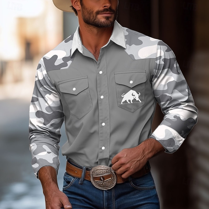 HOT ! Men's Camouflage Bull Shirt Western Shirt Cowboy Shirt Long Sleeve Vintage Western Style Outdoor Daily WorkWear Fall & Winter Turndown 3D Print Front Two Pockets Button Up Shirts Black White Gray