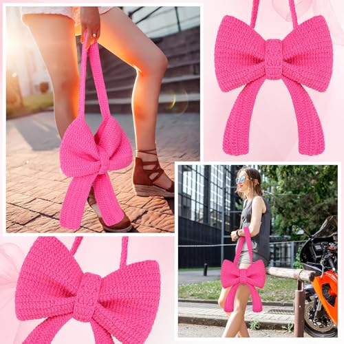 HOT ! Aliceset Crochet Bow Bag Bright Pink Coquette Beach Tote Bag for Women Cute Aesthetic Knitted Shoulder Handbag Travel Photo Props Gift for Girls Bow Lovers