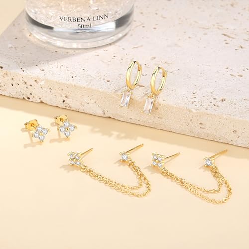 Gold Chain Stud Earrings for Women Trendy Minimalist 14K Gold Small Huggie Hoop Birthstone Earring Sets for Multiple Piercing Hypoallergenic Earring Stacks 3