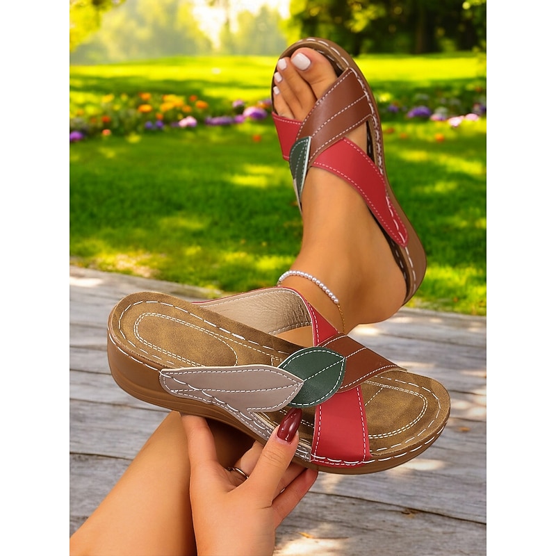 HOT ! Women's Multicolor Leaf Patchwork Slide Sandals - Open-Toe Comfortable Wedge Slippers for Casual & Outdoor Wear