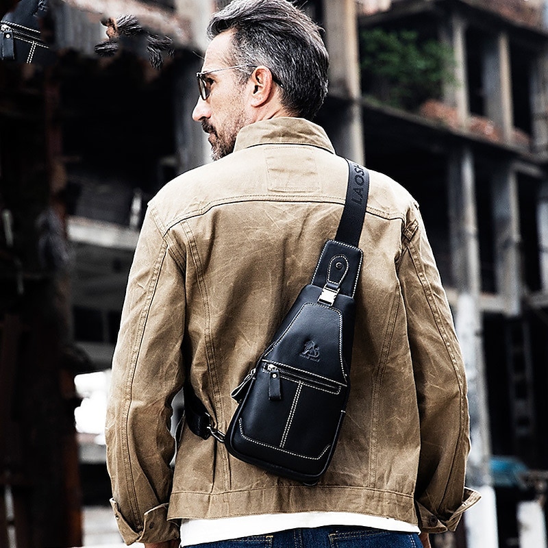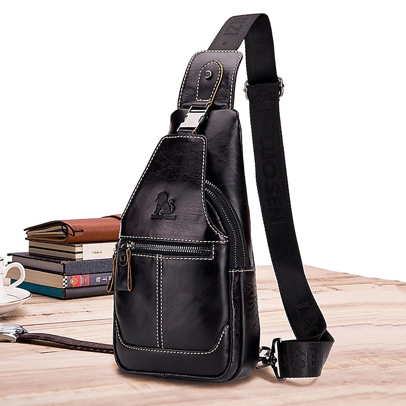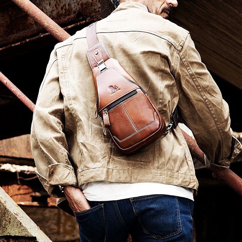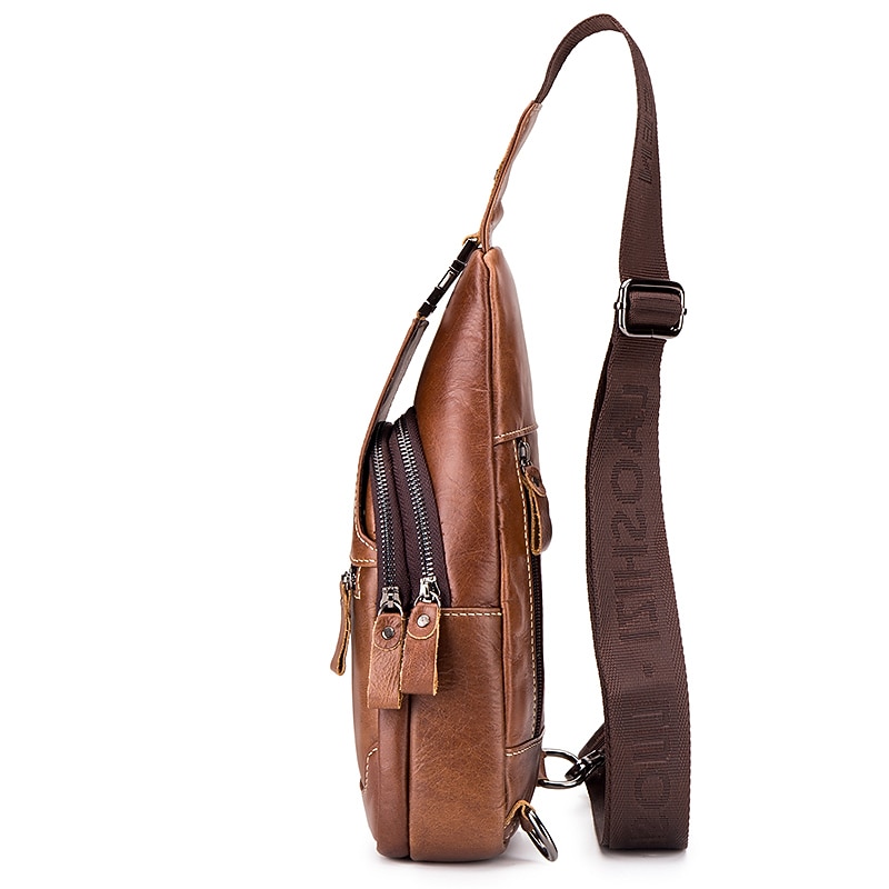 HOT ! Men's Brown Leather Sling Bag with Adjustable Strap and Multiple Zipper Pockets – Stylish Crossbody Travel and Casual Shoulder Bag