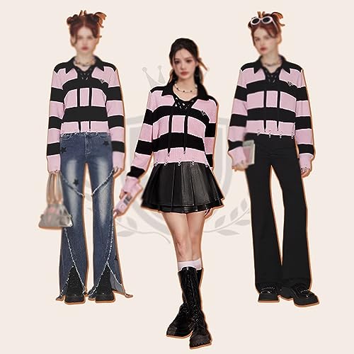 • ♥ Very girly color scheme, black + pink striped sweater, easy-to-match light and short version, complementary contrasting colors, simple and white