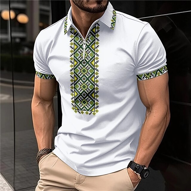Highlights Thrilled to present an exclusive uniquely designed Men's Zip Polo Golf Shirt This snazzy polo shirt crafted from polyester is not your average street wear - it features geometric graphic prints a lapel neckline short sleeves and a zipper detail It's machine-washable breathable and guarantees both style and comfort for everyday wear or outdoor activities Each piece is singularly crafted ensuring it's as special as you are