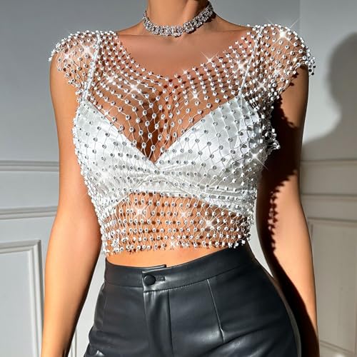 Rhinestone Crystal Crop Top, Sleeveless Mesh Body Chains, See Through Mesh Diamond Fishnet Shirts Outfits 1