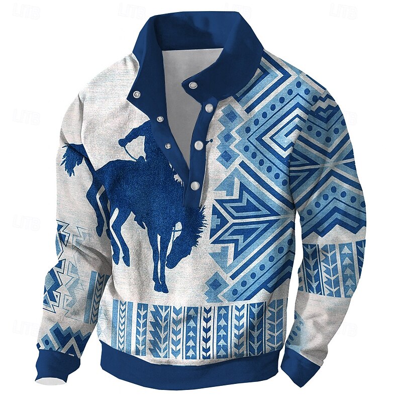 Men's Patchwork Sweatshirt Ethnic Vintage Retro High Neck Outdoor Home Sports Outdoor Blue Brown Buttons Fall Winter Designer 1