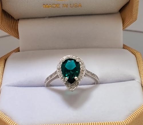 Galaxy Gold GG Stunning 1.69 Carat Total Weight 14K Solid White Gold Emerald and Natural Diamond Halo Ring Brilliant Pear Cut Tear Drop Shape Round Diamonds Anniversary Engagement Promise Ring 6