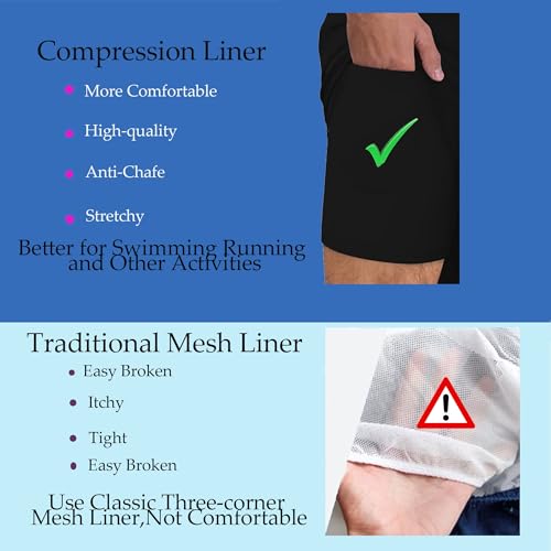 • FEATURES - New generation compression with liner phone design. This luxurious liner is a lightweight, super-supporting, abrasion-resistant flat-angle inner lining, which can protect your skin from chafed, and to prevent the embarrassment of sticking to the skin when the swim trunks are soaked. Standard American size, 7 inch inseam, knee level length, traditional but stylish.
