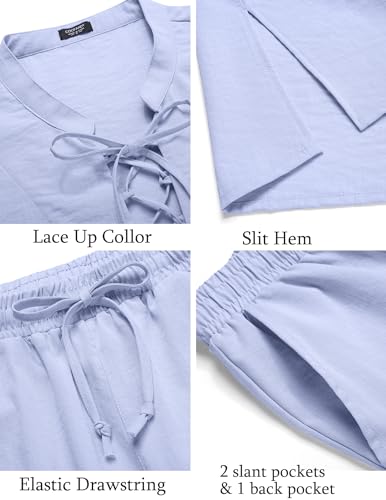 • 【 2 Piece Set 】 1.Men's long sleeve henley shirts feature stand collar, lace up V neck, split cuffs and bottom sides, a straight-cut hem. 2. Mens casual beach pants feature elastic drawstring waist, loose fit, two slant pockets and one back pocket perfect for storing phones, sunglasses, etc.