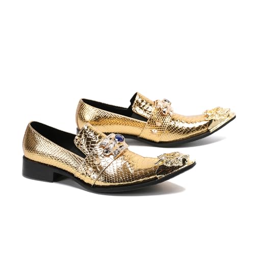 Mens Dress Shoes, Gold Loafers Cowhide Shoes Genuine Leather Large Size Low Top Metal Toe Slip-Ons Breathable Comfortable Casual Shoes 6