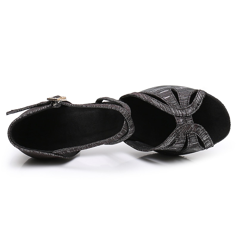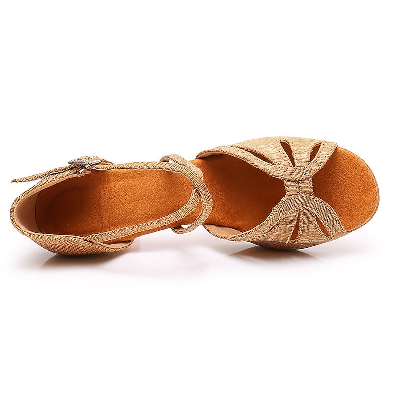 : These shoes feature an adjustable ankle strap adorned with a sparkling rhinestone buckle, adding a touch of glamour to the overall design. The cut-out details enhance the chic aesthetic, while the cushioned insole ensures comfort during extended wear. The outer suede sole offers the perfect balance of grip and glide, crucial for seamless dance movements.