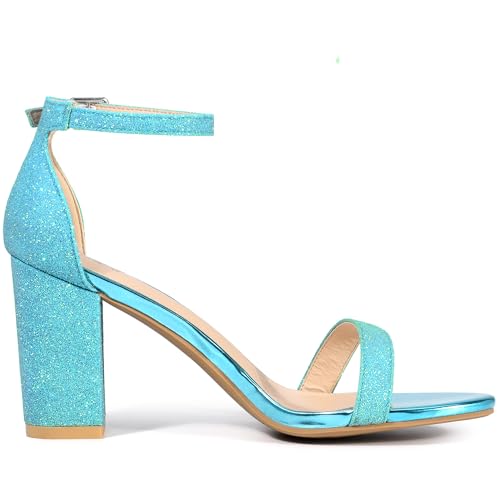 • Glitter Heels Sandals, Ankle Strap, Open Toe, Block Heel, Buckle Closure