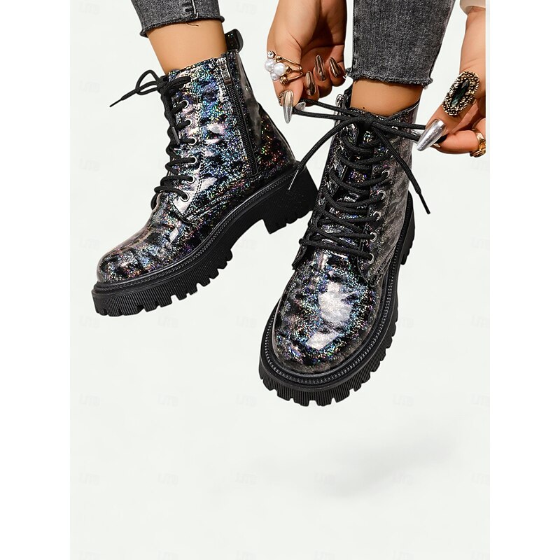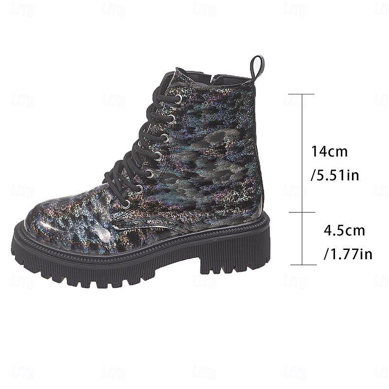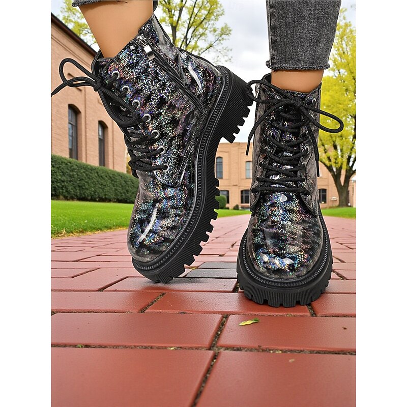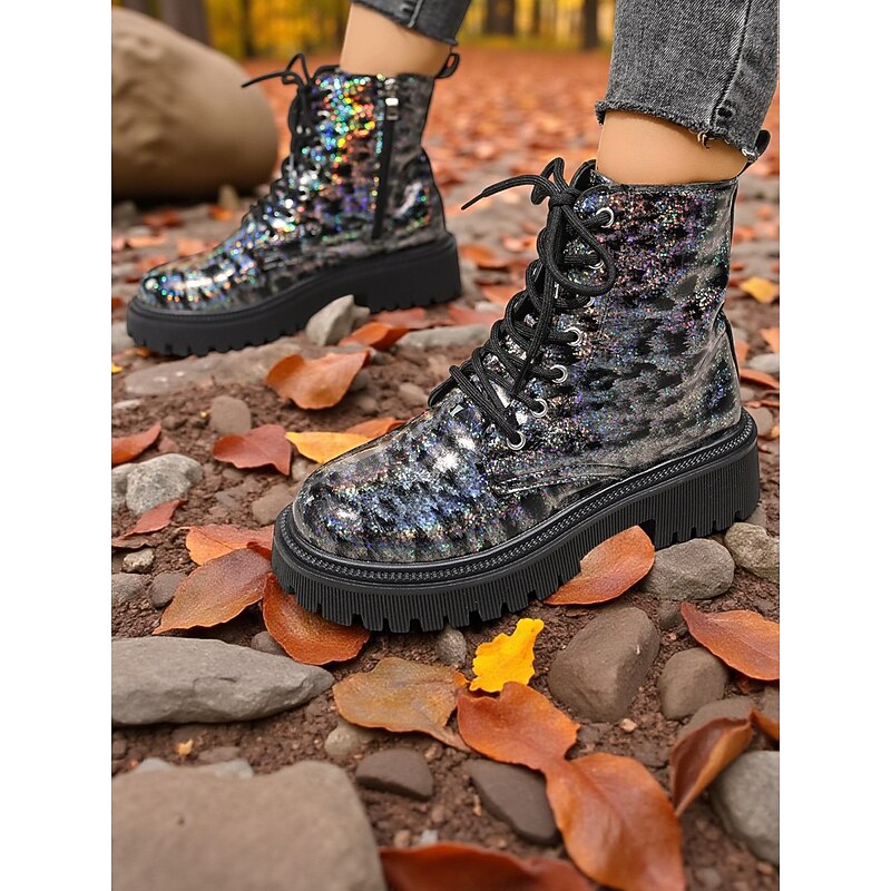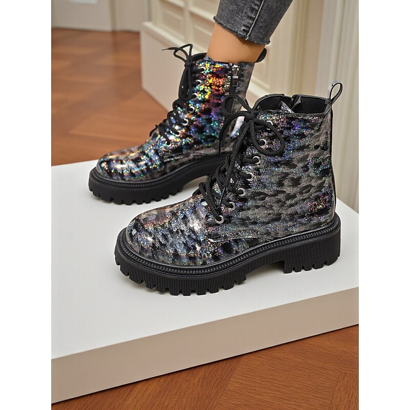 HOT ! Women's Glitter Leopard Combat Boots Chunky Sole - Fashion Lace-Up Ankle Boots for Women Urban Streetwear and Casual Outfits