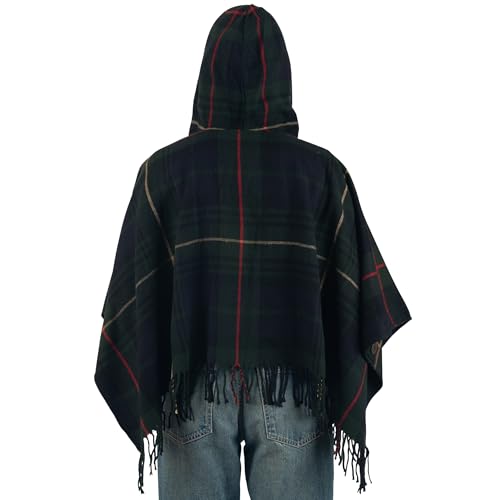 • DESIGN – The hooded design keeps your head toasty warm and the fringe on this wrap adds a fun flare and moves beautifully. The hidden buttons under the arms can be used to create batwing sleeves. Measures 43.5” inches shoulder width x 44.75” inches long.