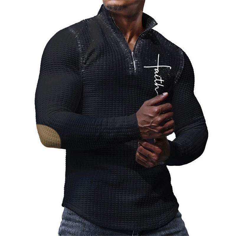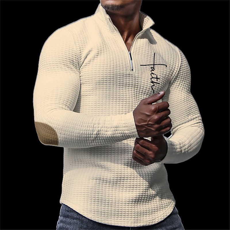 Highlights [Fabric]: Crafted from a high-quality blend of polyester and spandex, this men's athletic polo shirt features a unique waffle-knit texture that provides both warmth and breathability. Its moisture-wicking properties ensure comfort during physical activities, making it an ideal choice for cooler seasons like fall and winter. [Fit]: This long-sleeve polo shirt offers a fitted, body-hugging silhouette designed to enhance the wearer's physique. The elastic quality of the fabric allows for flexibility and ease of movement, making it suitable for both casual and athletic settings. [Design Highlights]: Featuring a quarter-zip design with a turndown collar, this polo adds a sporty edge to your wardrobe. The crisp white color is accented by subtle graphic text on the chest, creating a modern and stylish look. The 3D print adds a dynamic element to the design, ensuring you stand out in any setting. [Occasions]: Perfect for casual daily wear or a more active lifestyle, this polo shirt transitions seamlessly from a day out on the golf course to a relaxed weekend gathering. Its versatile style pairs effortlessly with jeans or athletic shorts, making it a staple in any wardrobe. [Size Range]: Available in a wide range of sizes from S to 3XL, this shirt offers options for both regular and larger body types, ensuring a comfortable fit for every individual.