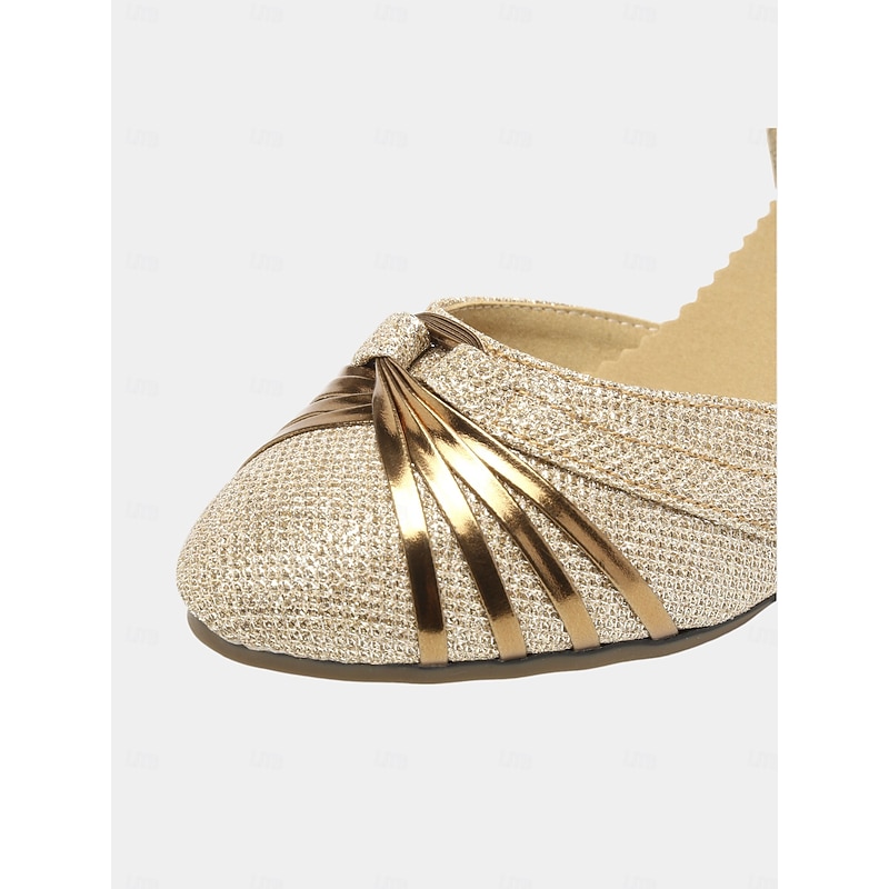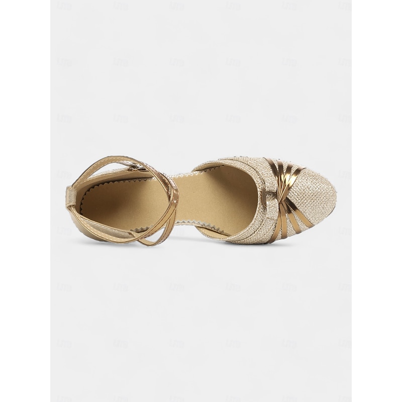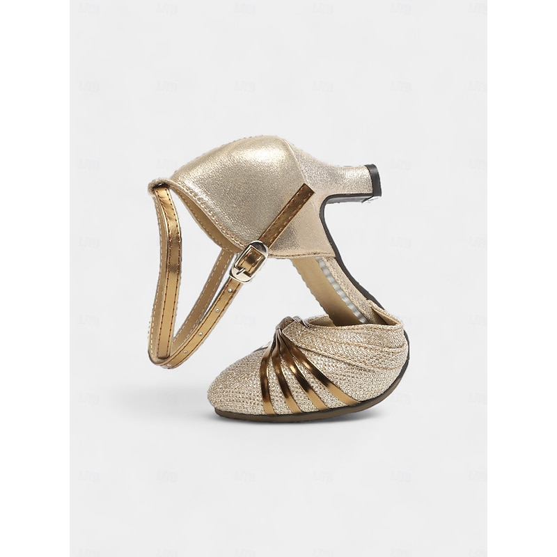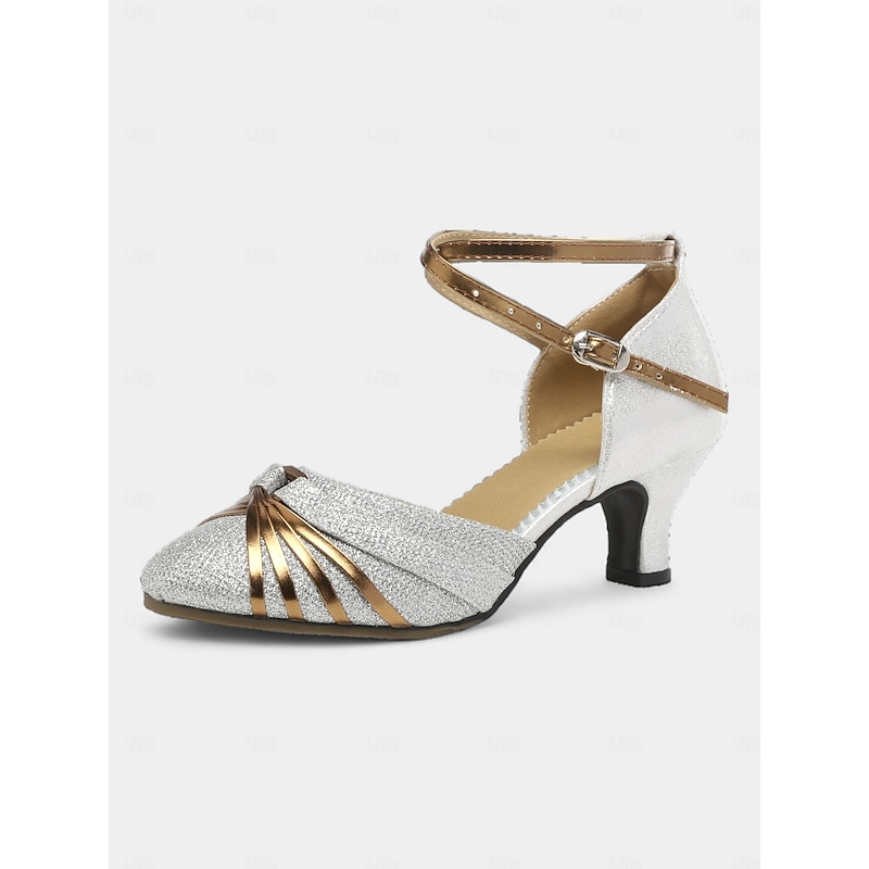 Highlights [Fabric] : Designed with sparkling glitter upper materials, these women's dance shoes offer a dazzling finish that catches the light beautifully. The textured fabric not only provides a glamorous look but also ensures durability and comfort during wear. [Design and Fit] : The shoes feature a round closed-toe design with exquisite golden accents that elegantly fan out towards the sides. The adjustable buckle ankle straps allow for a secure and customized fit, while the low to mid-height heels of approximately 2.17 inches provide comfort without compromising on style. [Design Highlights] : These ballroom dance shoes boast a chic and sophisticated appearance, enhanced by their shimmering glitter material and classic silhouette. The practical lace-up closure ensures a snug fit, making them perfect for swift dance movements. [Occasions] : Ideal for dance events such as Samba, ChaCha, and Rumba, these shoes also make a stylish choice for parties and evening gatherings. Their elegant design easily complements various formal attires, adding a touch of glamour to any occasion. [Size Recommendation] : Available in a range of sizes from US5.5 to US9.5-10, these dance shoes cater to different foot sizes, ensuring you find the perfect fit for your dance and event needs.