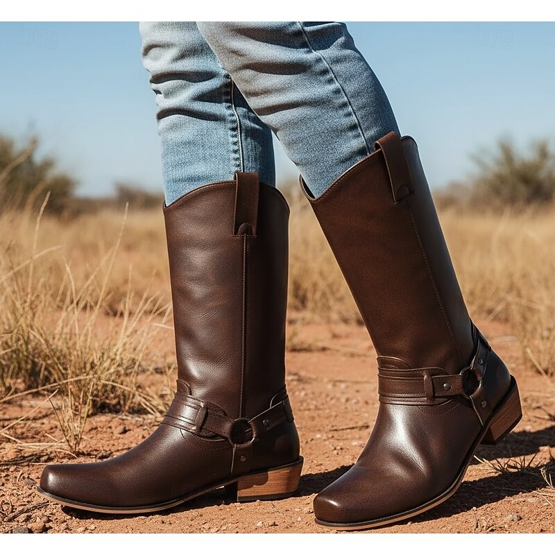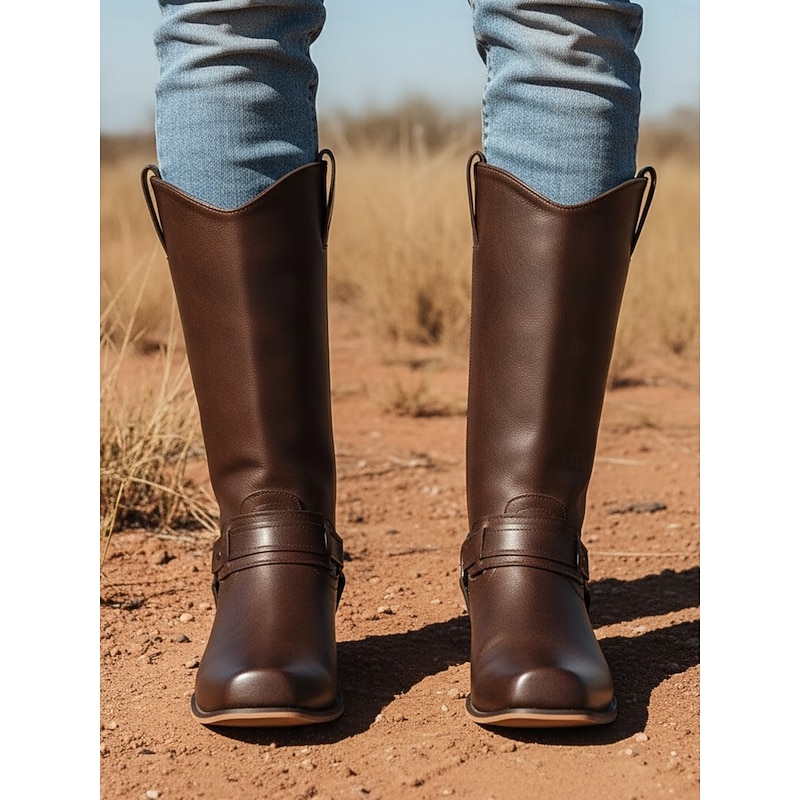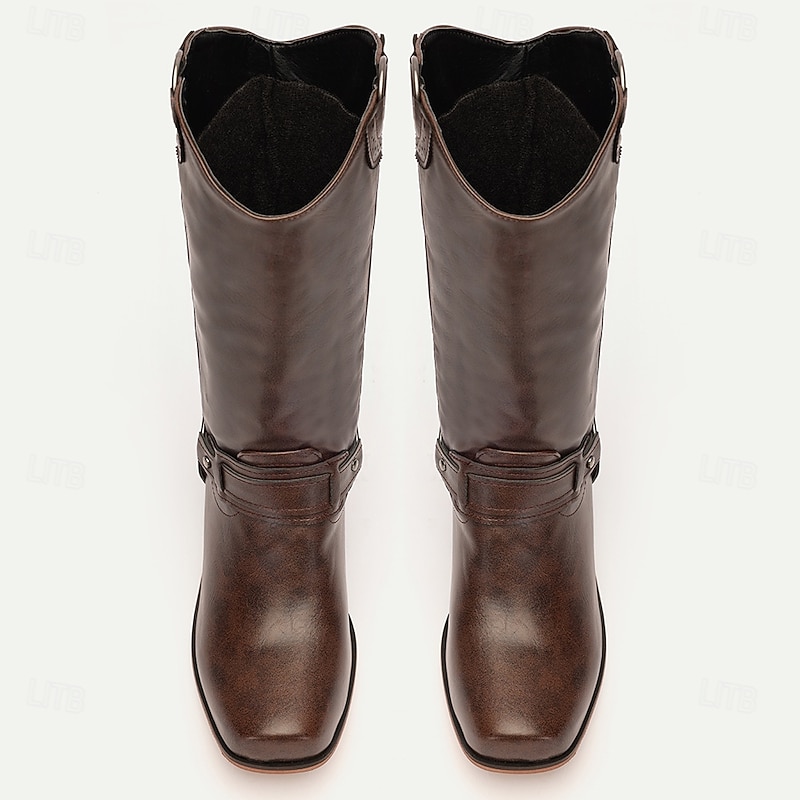 Men's Brown Faux Leather Western Motorcycle Riding Boots - Classic Style with Harness Detail for Equestrian and Casual Wear 4