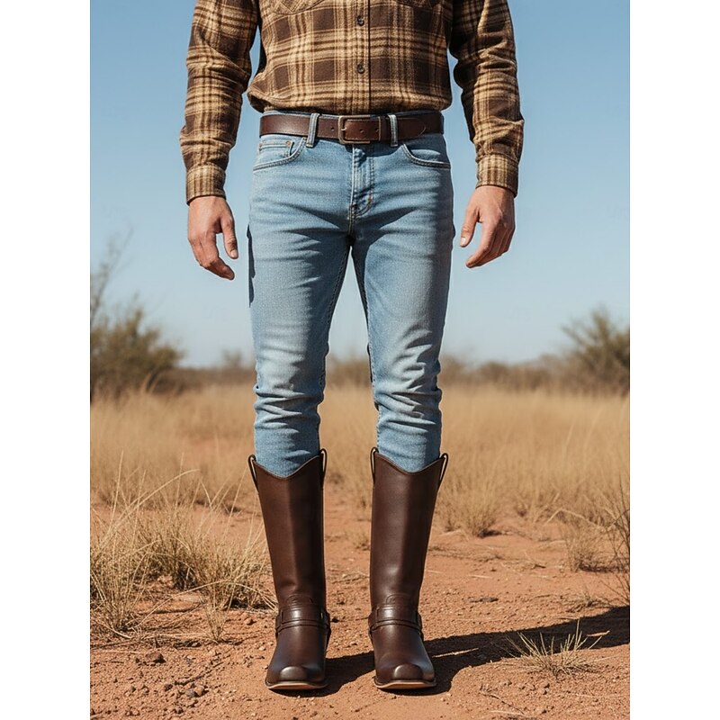 Men's Brown Faux Leather Western Motorcycle Riding Boots - Classic Style with Harness Detail for Equestrian and Casual Wear 1