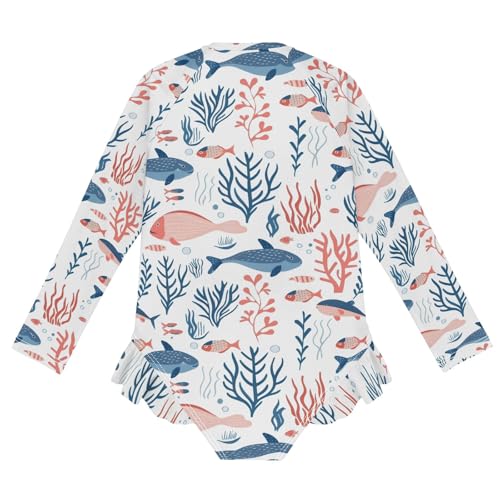 Fish Coral Girls Long Sleeve Swimsuit Rash Guard One Piece Bathing Suits Zipper 3-12T 3