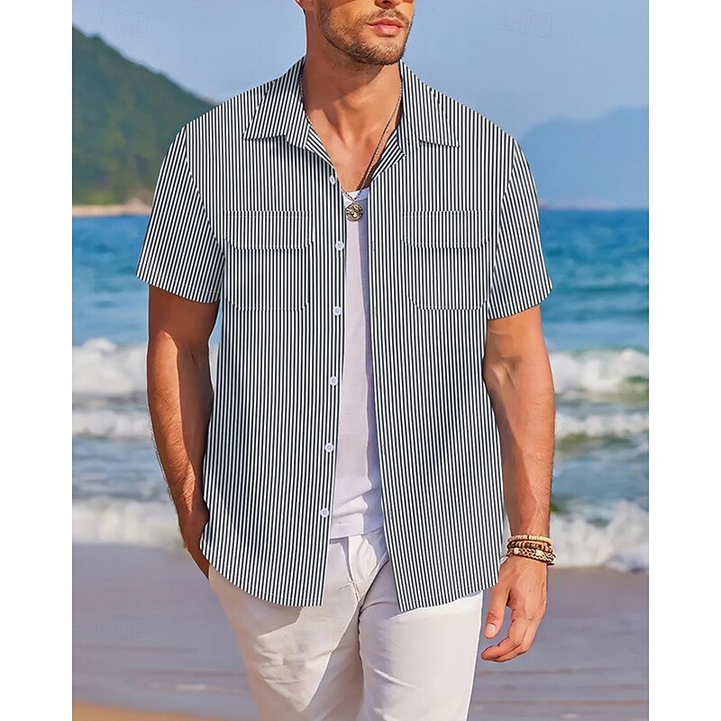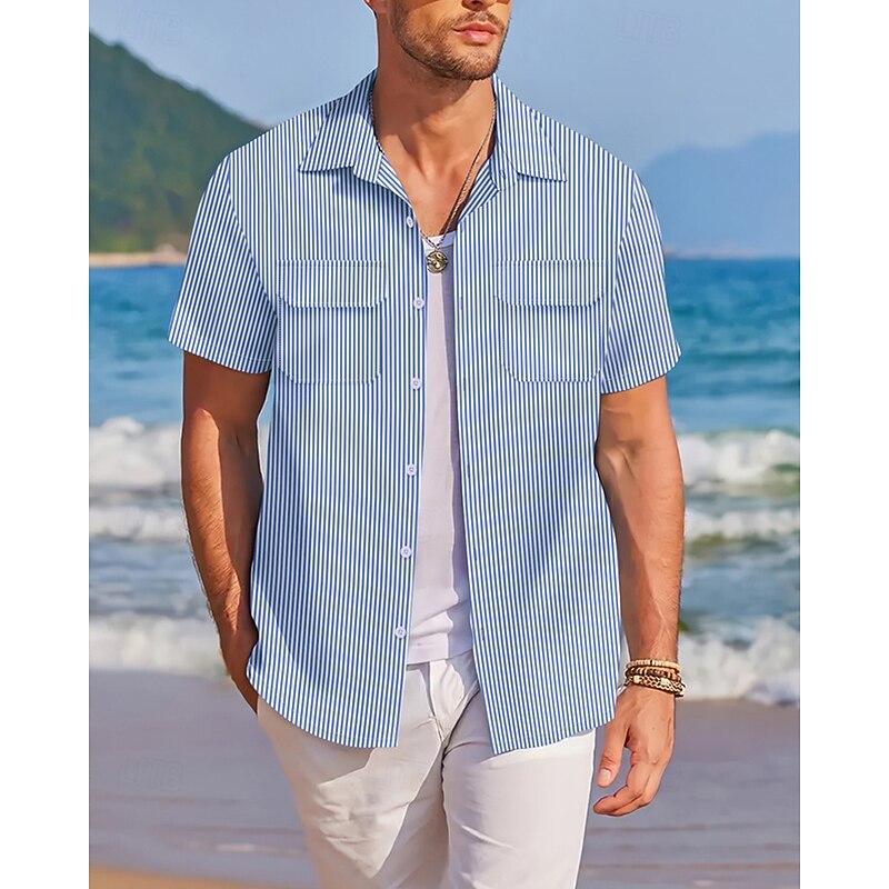HOT ! Men's Shirt Summer Shirt Casual Shirt Beach Shirt Button Up Shirt Pink Wine Blue Green Deep Blue Short Sleeve Stripes Lapel Vacation Hawaiian Front Pocket Clothing Apparel Cotton Blend Fashion Casual