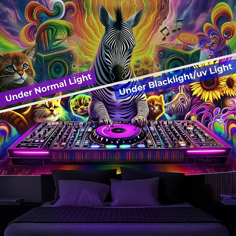 HOT ! Blacklight Tapestry Glow in the Dark Glow Party UV Reactive Trippy Misty Animal DJ Hanging Tapestry Wall Art Mural for Living Room Bedroom