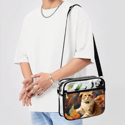 HOT ! Space Cat with Pizza Large Crossbody Bag Clear Stadium Bag Anti-Theft Side Shoulder Bags Messenger Bag with 2 Compartments