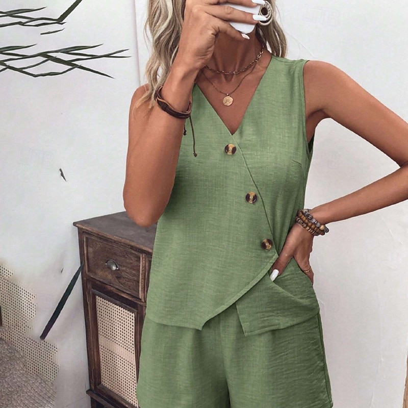 More information about Women's Streetwear Daily Blouse Shorts Sets Sleeveless V Neck Solid Color Dubbele Rij Knopen Outdoor Vacation Light Green Dark Navy Orange Summer Regular Fit