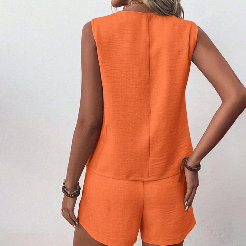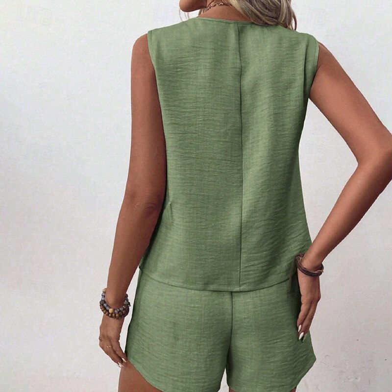 Women's Streetwear Daily Blouse Shorts Sets Sleeveless V Neck Solid Color Dubbele Rij Knopen Outdoor Vacation Light Green Dark Navy Orange Summer Regular Fit 11