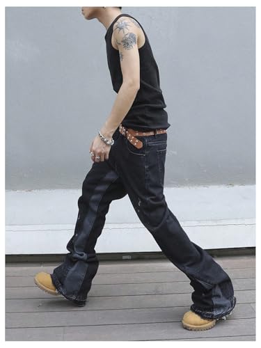 • Vintage clothes, grunge clothes, streetwear men, ripped design, raw trim, contrast color, straight leg, slant and back pockets, button and zipper closure