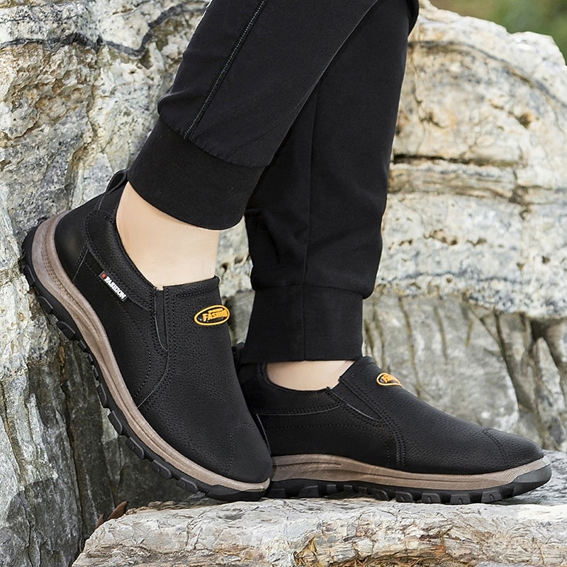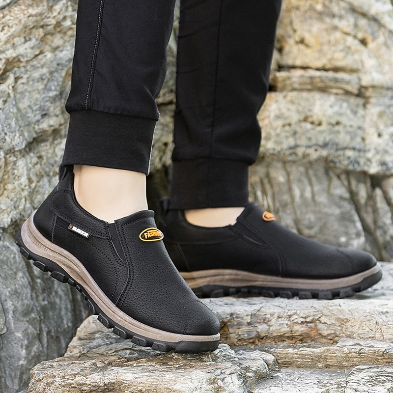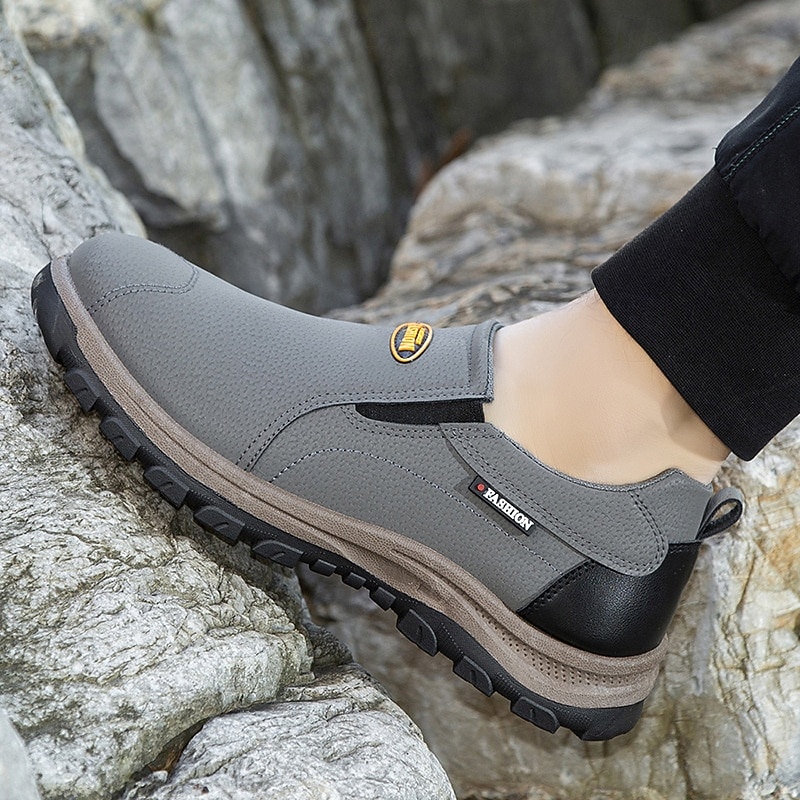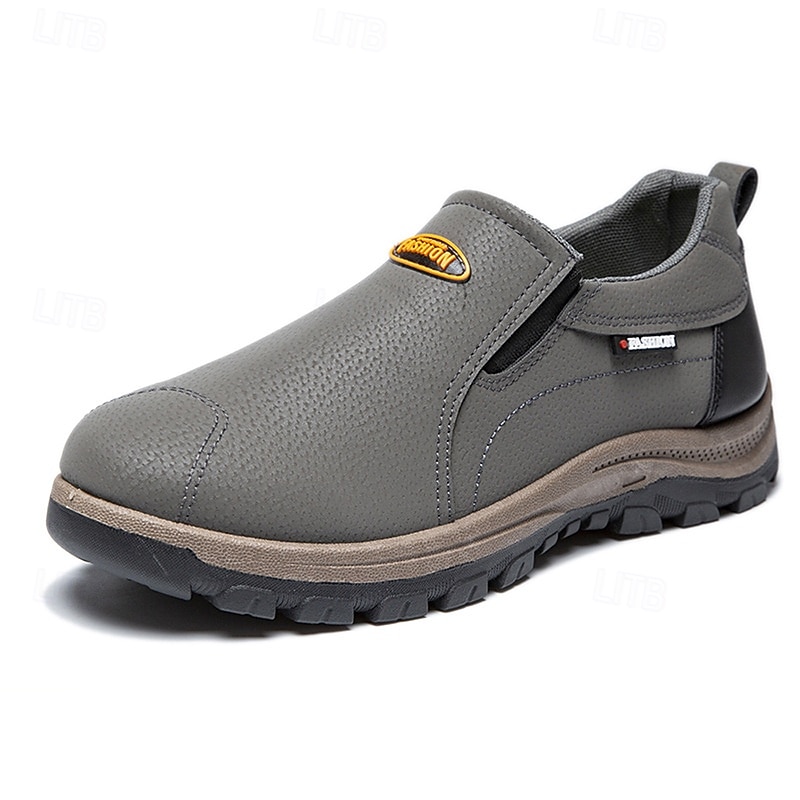 Highlights [Fabric] Crafted with a sturdy PU Leather upper and a breathable mesh lining, these men's slip-on shoes ensure long-lasting comfort and excellent airflow, making them ideal for active outdoor use. [Fit] The round toe design offers ample room for natural foot movement, while the slip-on construction allows for easy wear and removal, providing a snug yet flexible fit that adapts to your daily activities. [Design Highlights] Featuring a non-slip rubber outsole with a rugged pattern, these shoes provide dependable traction on various terrains. The stylish black accents add a touch of modern flair, complementing the neutral beige base for a versatile look. [Occasions] Perfect for hiking, trekking, casual outings, and day-to-day wear, these shoes seamlessly transition from outdoor adventures to everyday errands, making them a reliable addition to any wardrobe. [Size Range] Available in a range of sizes from US7 to US11, these shoes cater to a broad spectrum of foot sizes, ensuring a tailored fit for a variety of preferences.