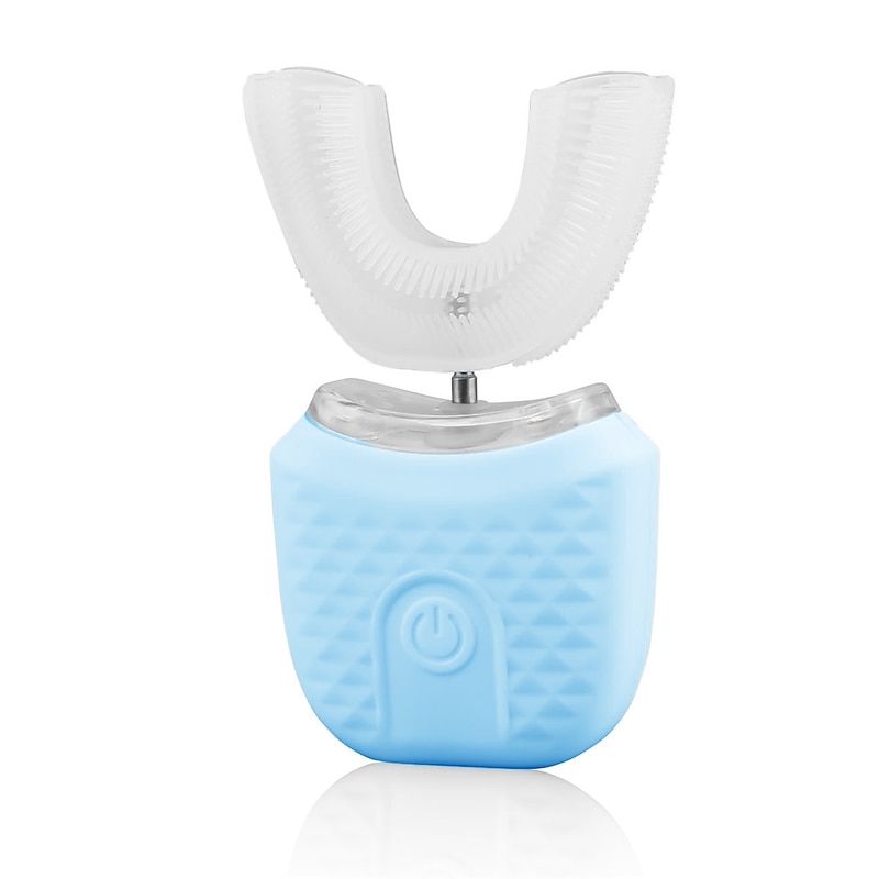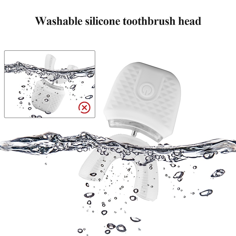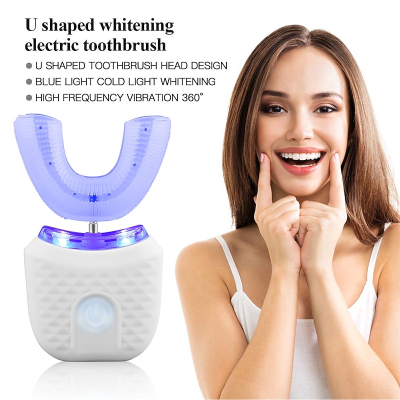 Highlights Product Selling Points: 1. Advanced Technology: This toothbrush utilizes blue and cold light whitening technology along with high-frequency vibrations to deliver effective cleaning and gum massage. It also helps promote blood circulation and reduces the risk of periodontal disease. 2. Versatile Modes: The toothbrush features four different modes - gentle, powerful, SPA, and cold light whitening mode. This allows users to customize their brushing experience according to their preferences and dental needs. 3. Safe and Hygienic: The U-shaped brush head is made from food-grade silicone antibacterial material, ensuring safe and effective cleaning. This material is also highly durable and resistant to bacterial growth. 4. Convenient Charging: The toothbrush comes with a smart charging base that can be used on either the left or right side. This adds to the convenience of charging and storing the toothbrush. 5. Waterproof and Easy to Clean: With a full waterproof seal (IPX7), the toothbrush is designed to withstand water exposure. This makes it easy to clean and maintain. Additionally, the toothbrush has an intelligent memory function and automatically times for 45 seconds, providing optimal cleaning.