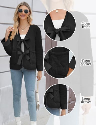 HOT ! Women's Cropped Puffer Quilted Jacket Floral Bow Tie Front Long Sleeve Padded Coat with Pocket