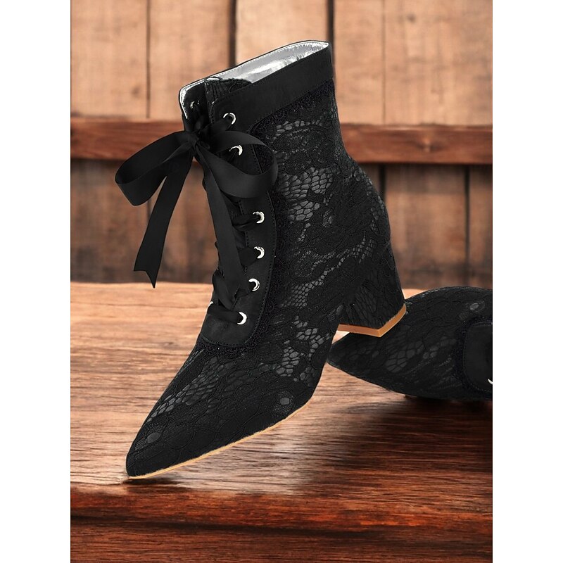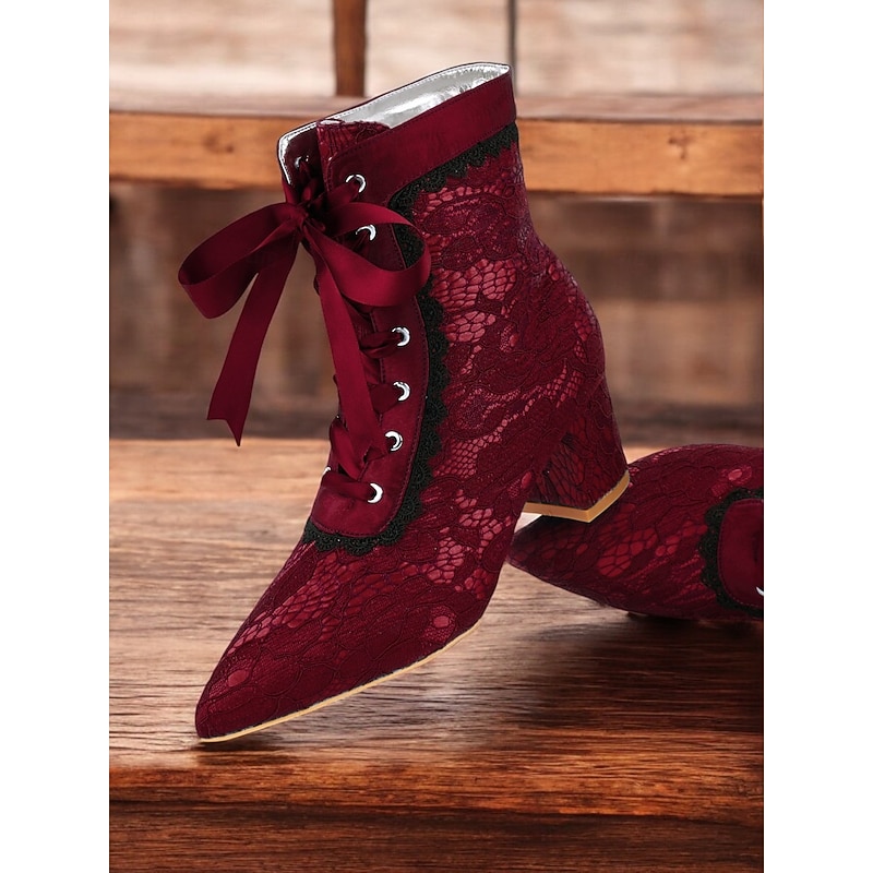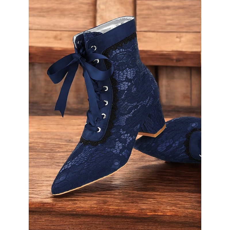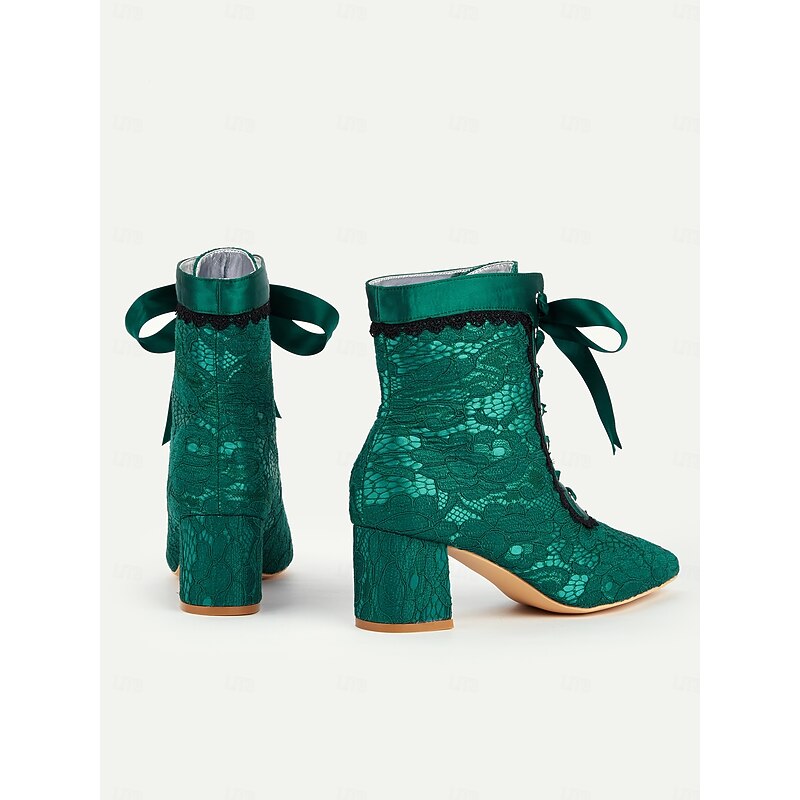 Highlights [Fabric] These Women's Victorian Lace-Up Boots are crafted from a luxurious combination of satin and lace. The elegant floral lace overlay enhances their sophisticated appearance, offering a touch of vintage charm perfect for any occasion. The interior lining is made from synthetic leather, ensuring comfort and durability. [Silhouette] Designed with a modern yet timeless silhouette, these ankle boots feature a pointed toe and a mid-height chunky heel, providing a blend of style and stability. The overall shape promotes a graceful posture, accentuating your ensemble with its refined structure. [Design Highlights] The boots are adorned with intricate black lace trims along the edges, adding an extra layer of sophistication. The lace-up closure with matching green satin ribbons not only ensures a secure fit but also adds a unique flair. The design is further characterized by its adjustable ankle fit, offering flexibility and ease of wear. [Occasions] Ideal for a variety of settings, these boots are perfect for parties, daily wear, and special occasions. Whether you're attending a festive event or enjoying a casual outing, they add a pop of color and elegance to any ensemble, making them a versatile wardrobe addition. [Size Notice] Available in a range of sizes from US5 / EU35 / UK3 to US13 / EU43 / UK11. It is recommended to select your usual size for the best fit.